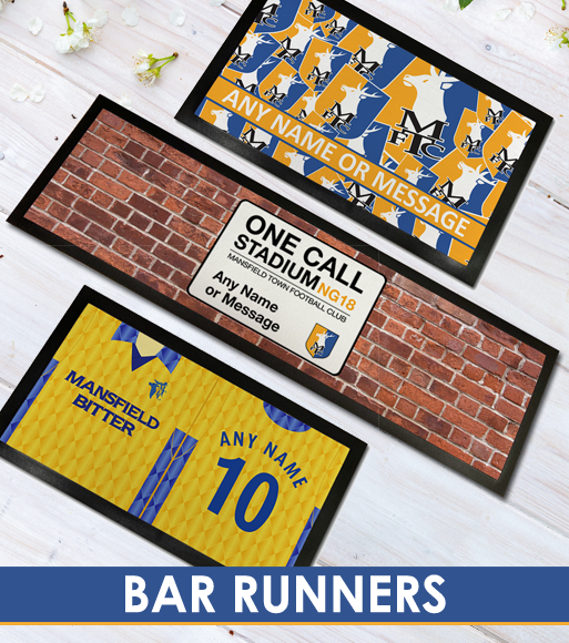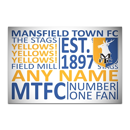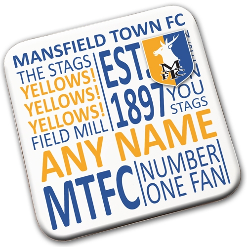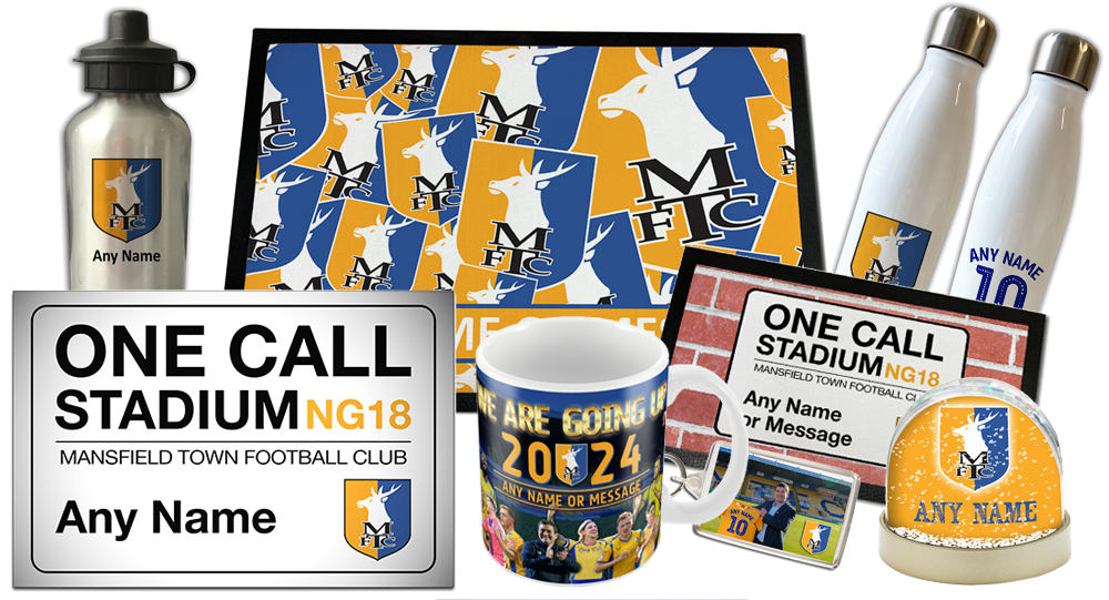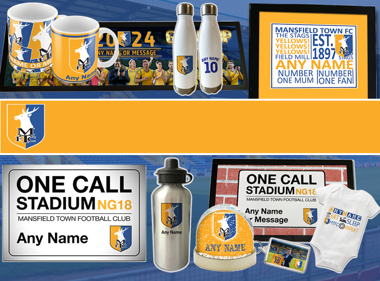 The Official Stags Personalised Gift Shop allows you to create your own MTFC personalised gift online in minutes. Including Mugs, Mousemats, Keyrings, Bar Runners, Framed Prints, Cushions and much more our personalised gift shop has the perfect gift for Mansfield Town fans of all ages. Celebrate great moments from our history, sign for the club or even get your name printed on the Mansfield shirt with our wide range of official Stags personalised gifts available at our Official MTFC Personalised Gift Shop.